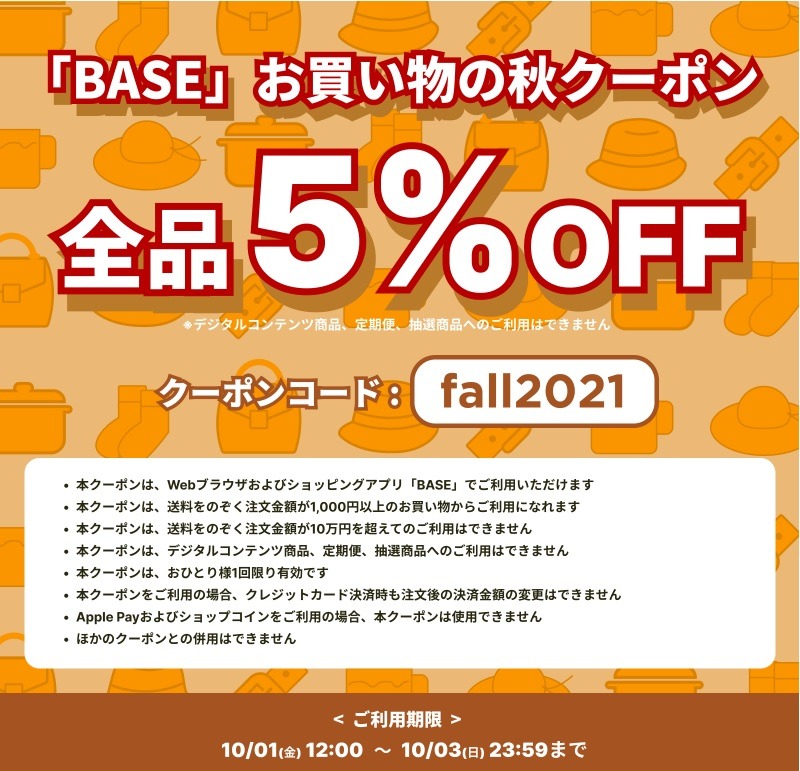 商品購入画面でクーポンコード≪fall2021≫を入力して下さい。