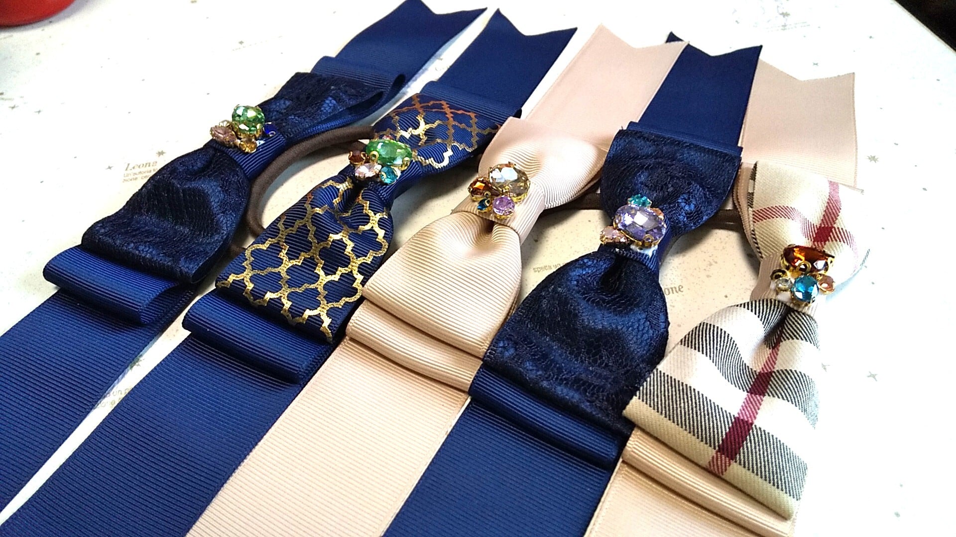 いくつも付けたキラキラでリボン足の長いヘアゴムです。