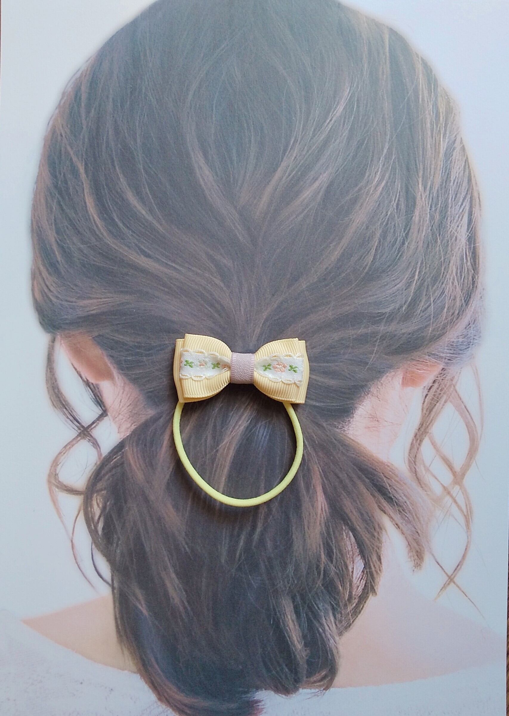 【ぷちヘアゴム】 黄色のお花刺繍 クリームイエロー リボン 2個セット