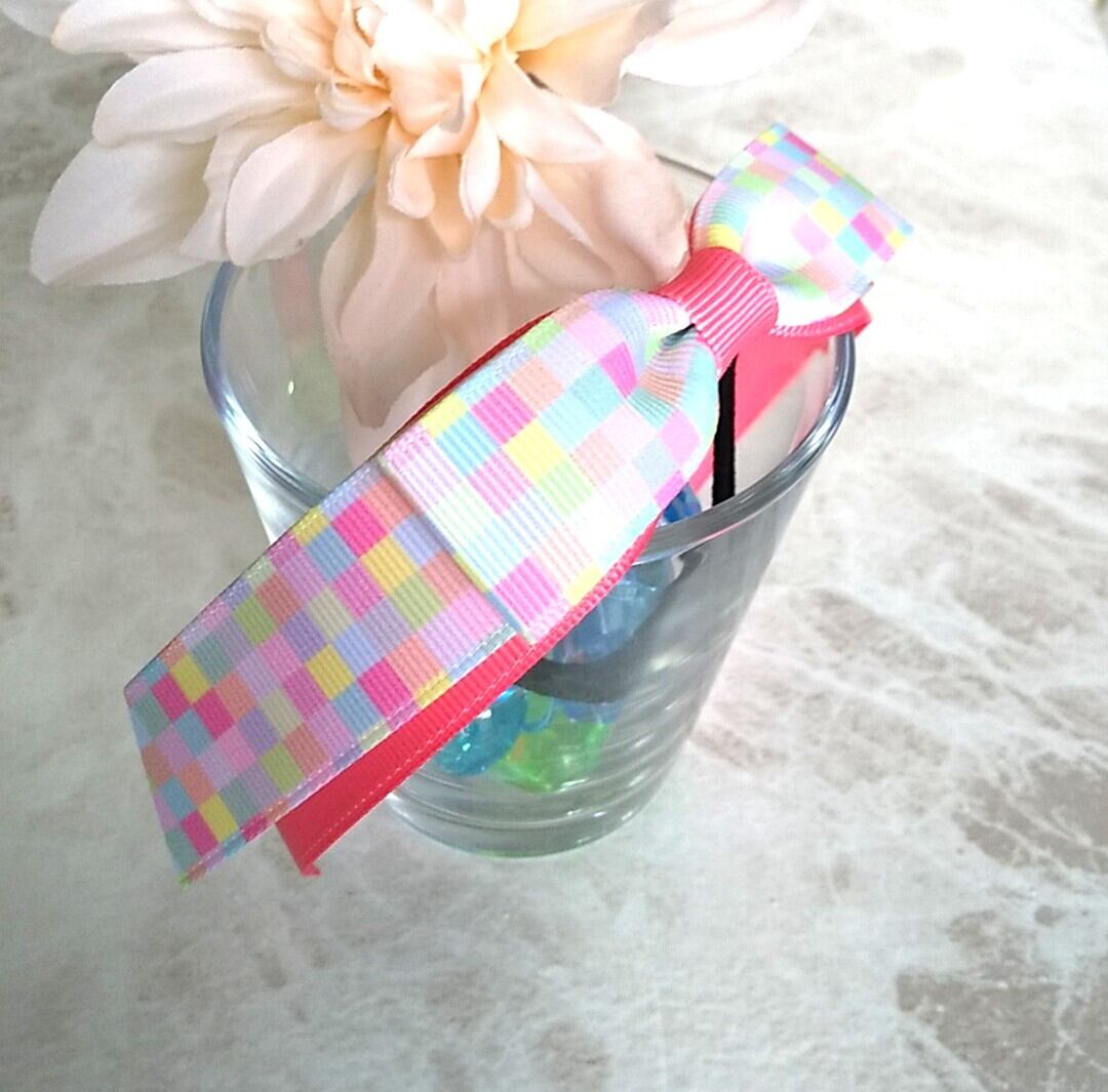 【ヘアゴム】パステルブロック柄 たらりんロングリボン