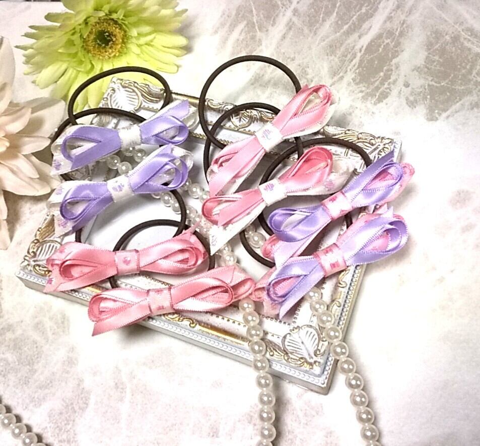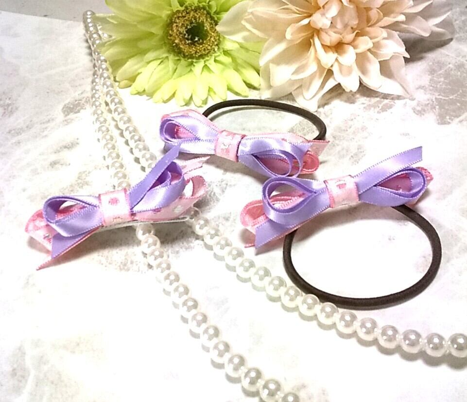 【ヘアゴム】スリムリボン パープル×ピンク 2個セット 選べるゴムサイズ