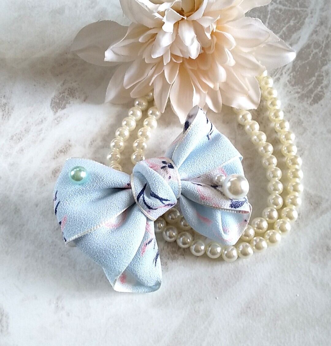 パールがついた花柄ブルーの立体リボン ヘアゴム/ヘアクリップ/ポニーフック