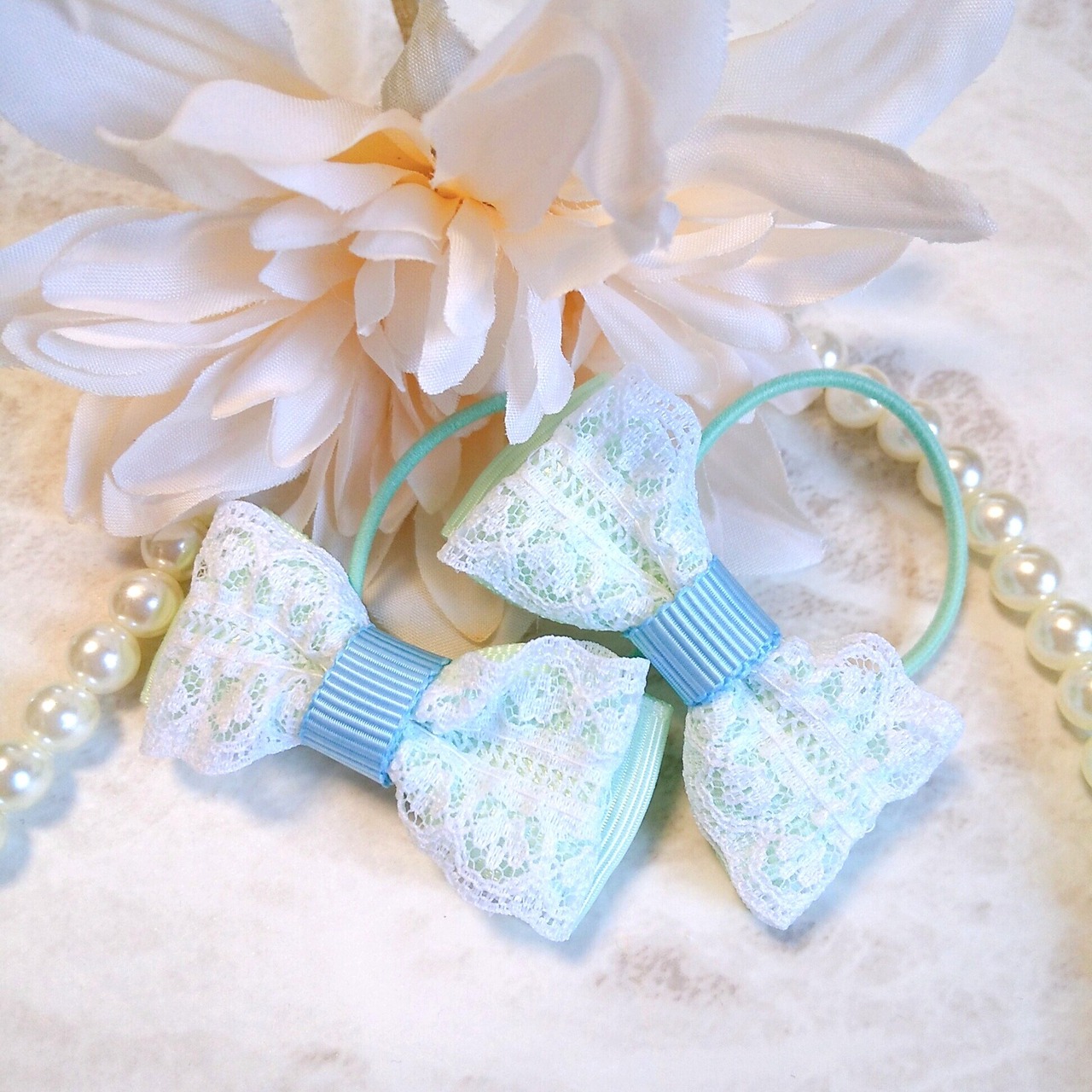 白いレースに爽やかなグリーンのリボンを合わせて、